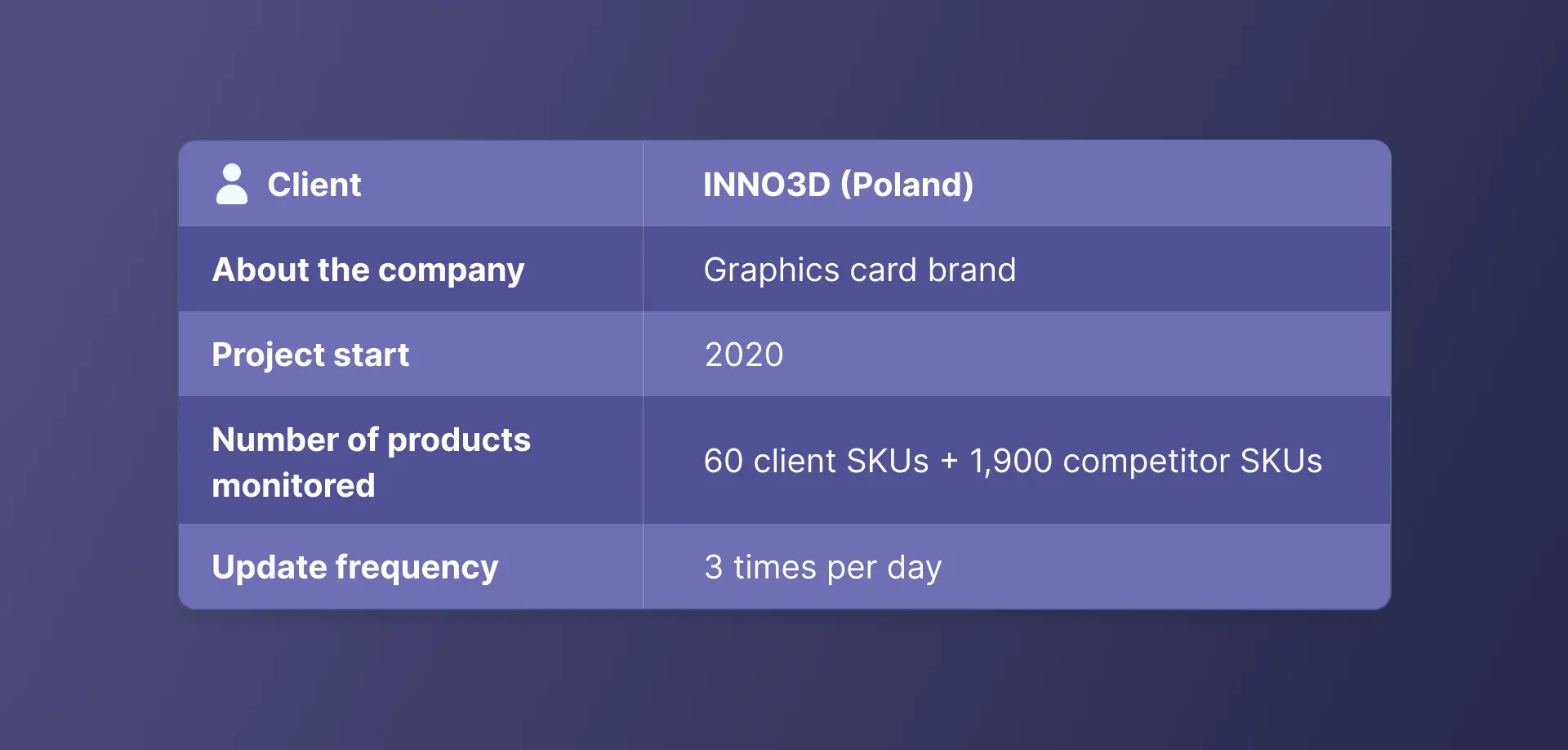 In 2020, INNO3D approached Pricer24 with the goal of automating market data collection to enable daily analysis of the brand’s positions and those of its competitors on key online sales channels in Poland.