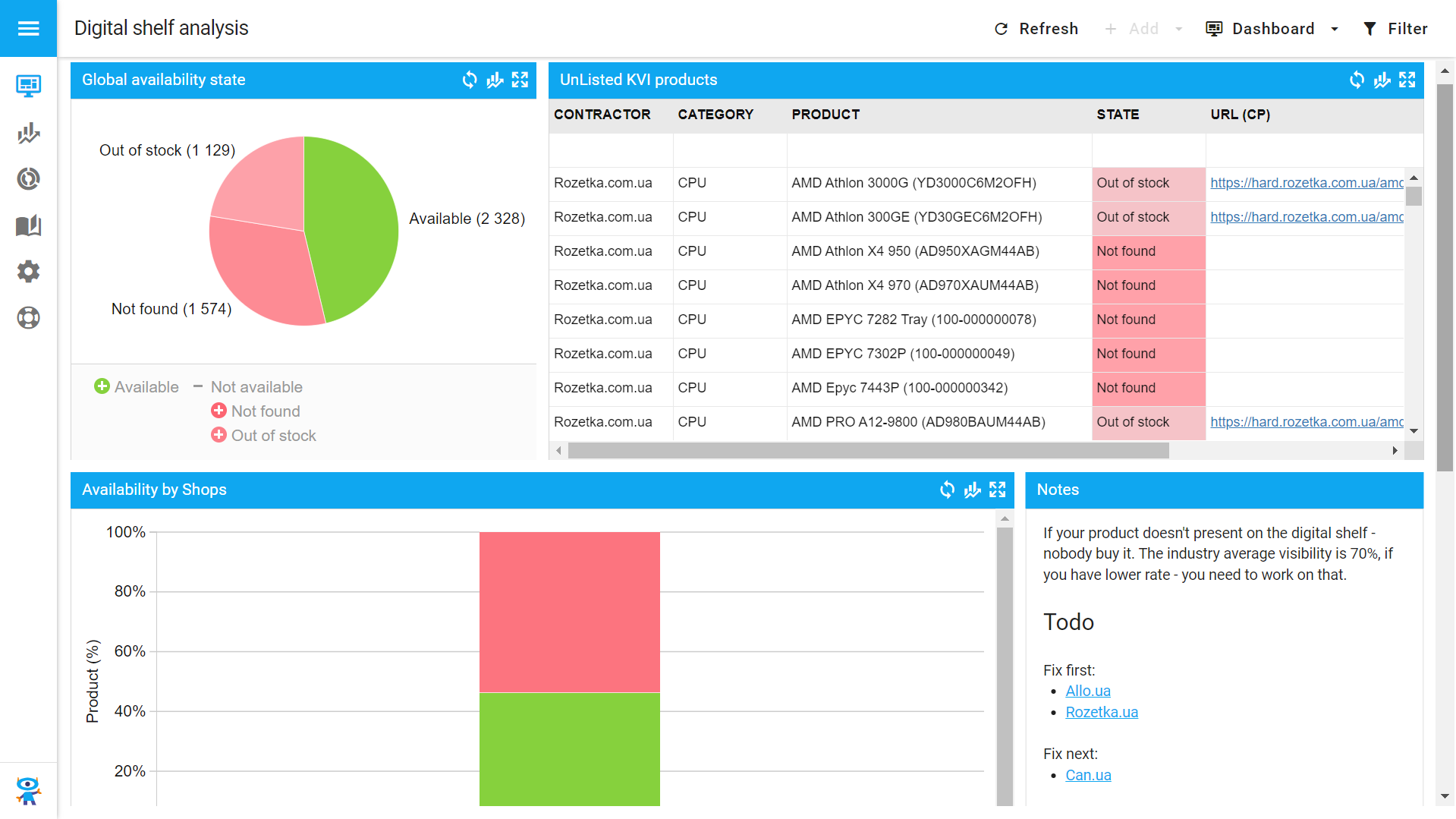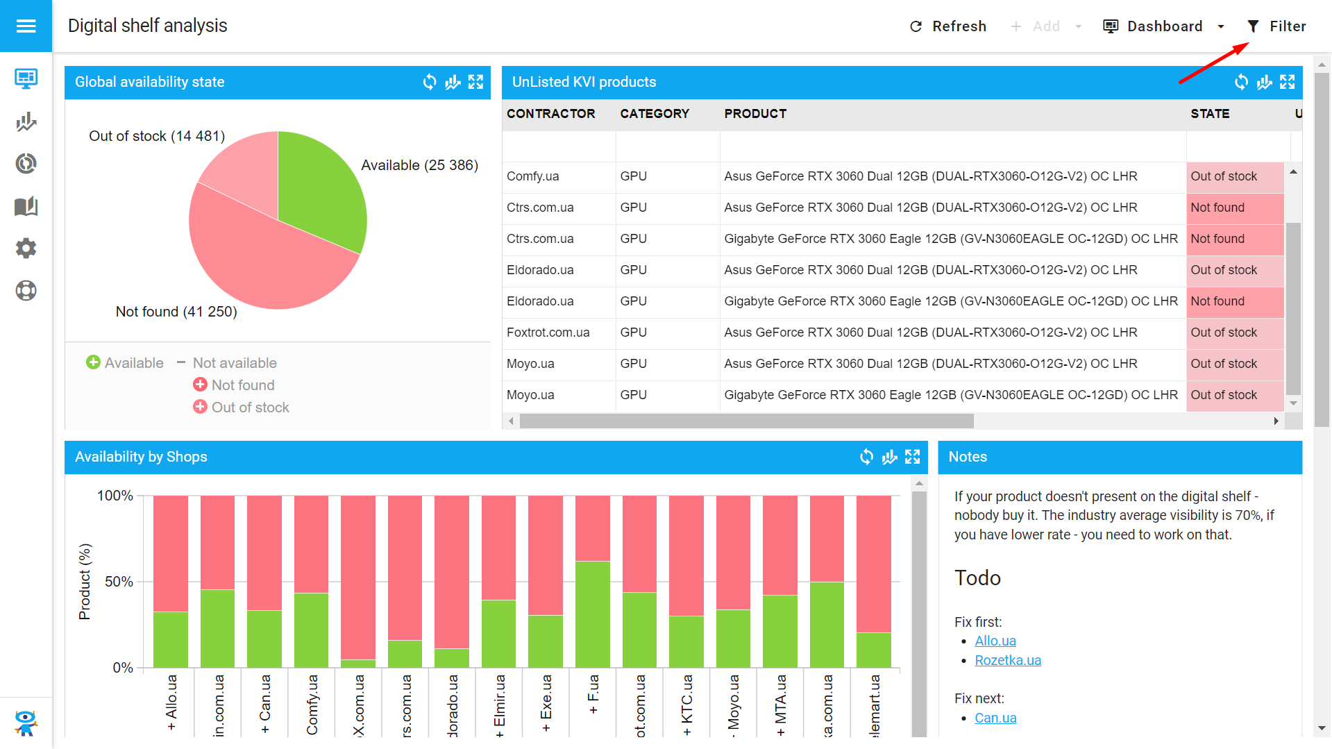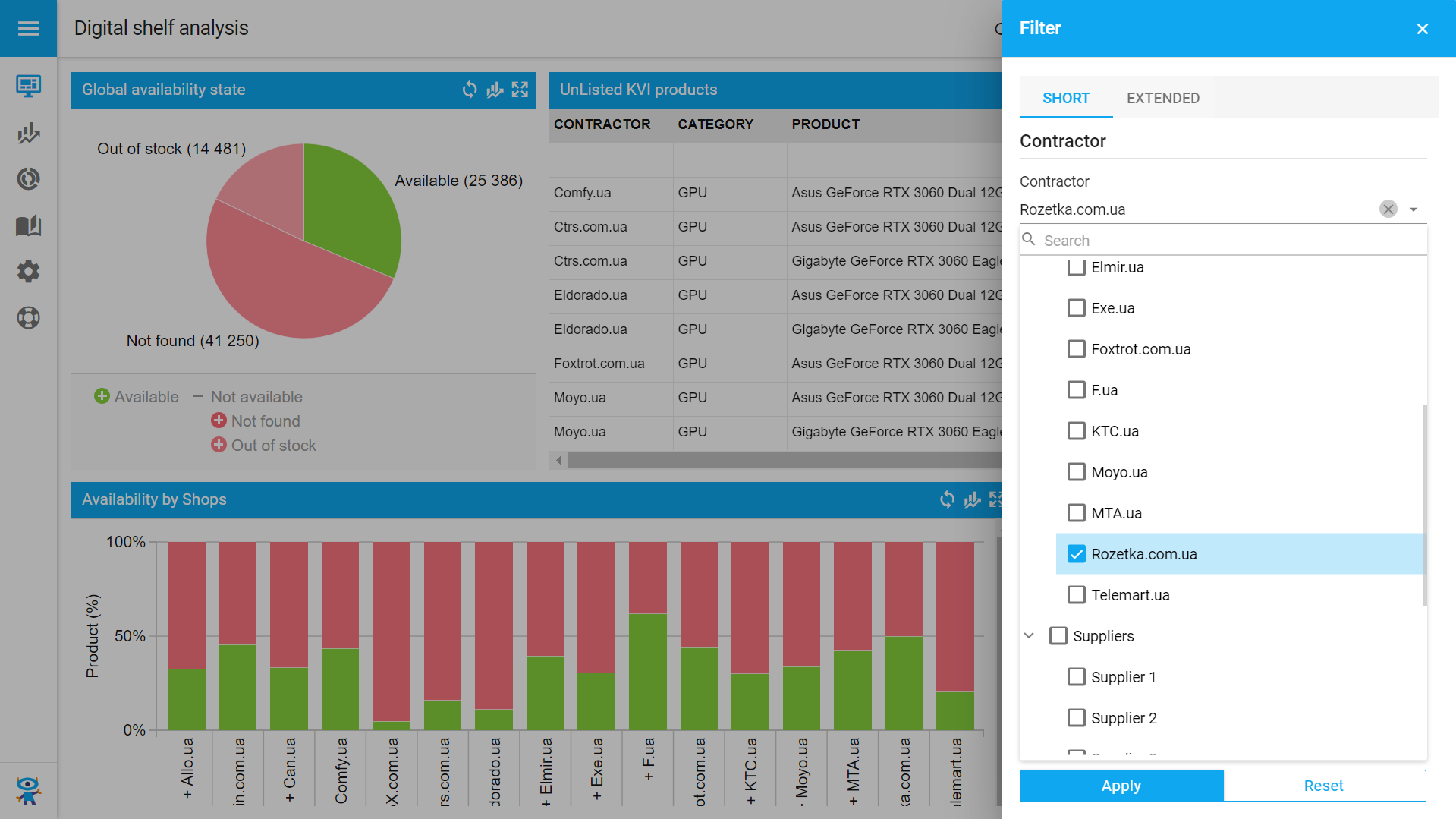 3. In the standard view, data in reports and graphs is loaded according to the configurations, as always. If you need to display information for a particular product or category, select the necessary filter. For example, we want to analyze your shelf presence only in the one store.