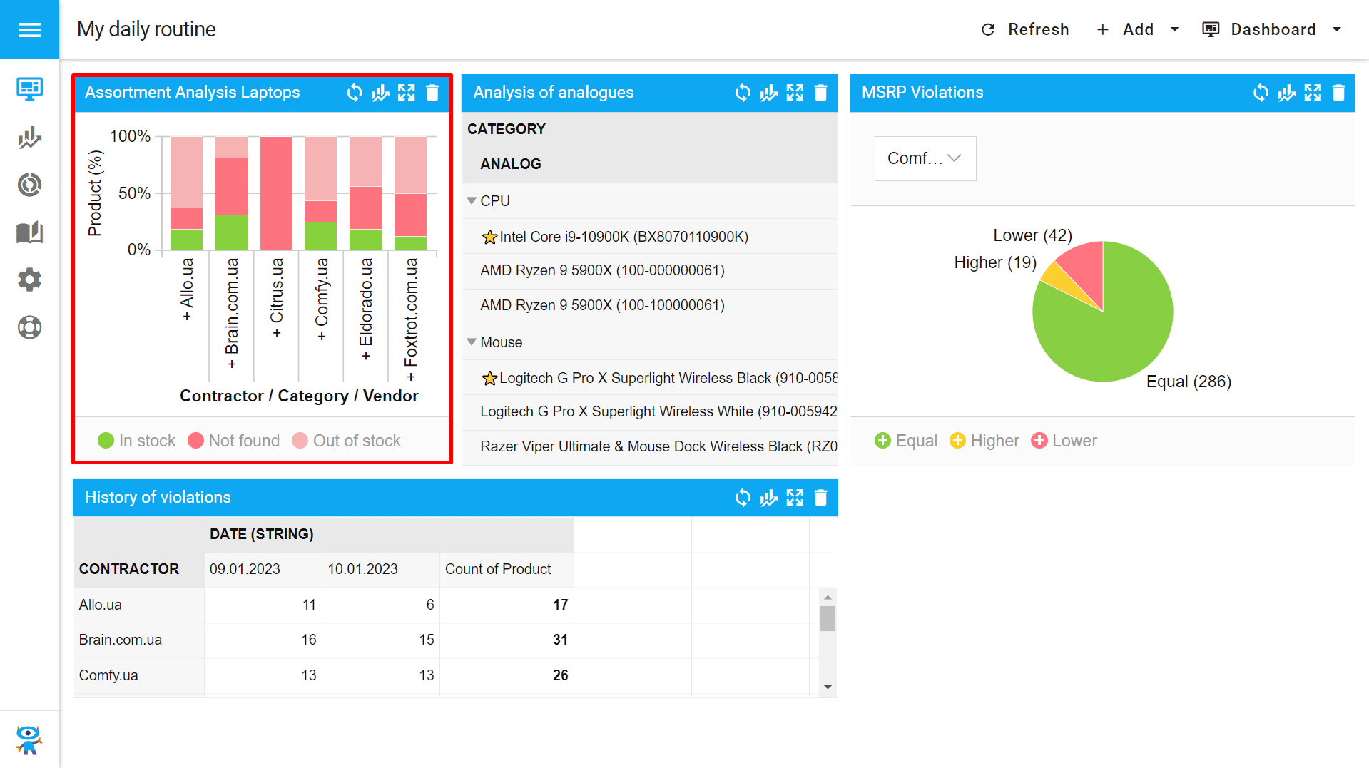 Monitoring the products’ availability on the partners’ electronic shelves is Sergiy’s routine. Therefore, he created a widget on the Pricer24 dashboard so that the leading indicators are always right before his eyes.