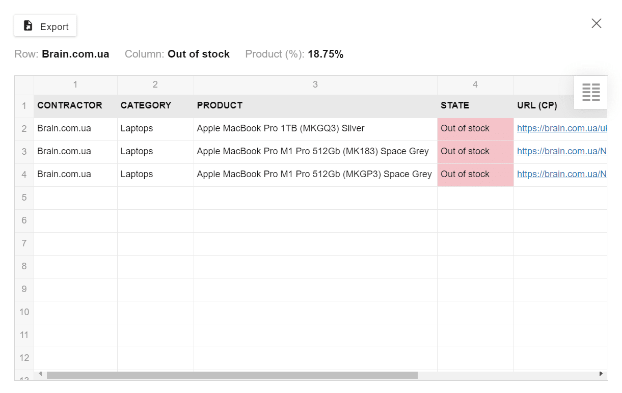 Going from the widget to the Assortment Analysis report, the manager sees how many products of his brand are available from counterparties (in partner stores), how many are not available, and how many were in stock but became unavailable for ordering (the status is “Out of Stock”).