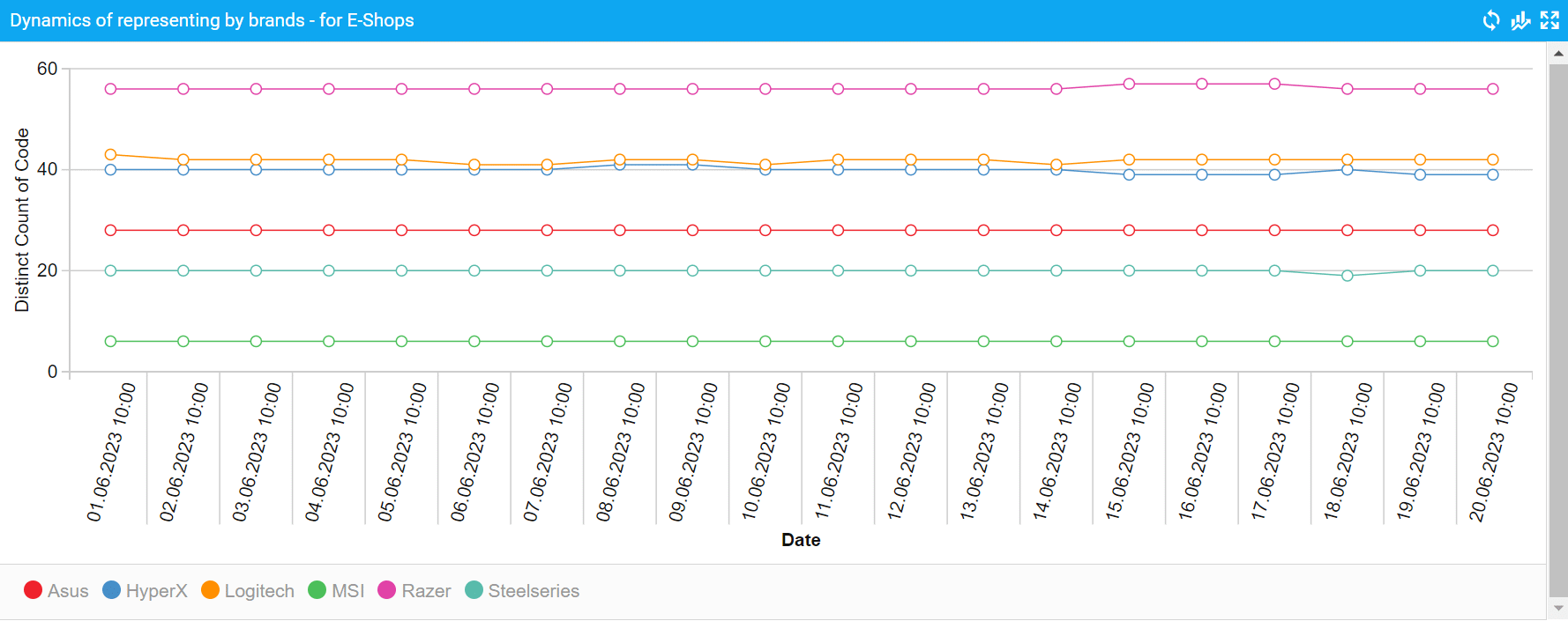 This graph illustrates how the market representation of each brand changes over a specific period. It allows you to notice trends such as a decrease or increase in the number of offerings for particular brands in a timely manner.