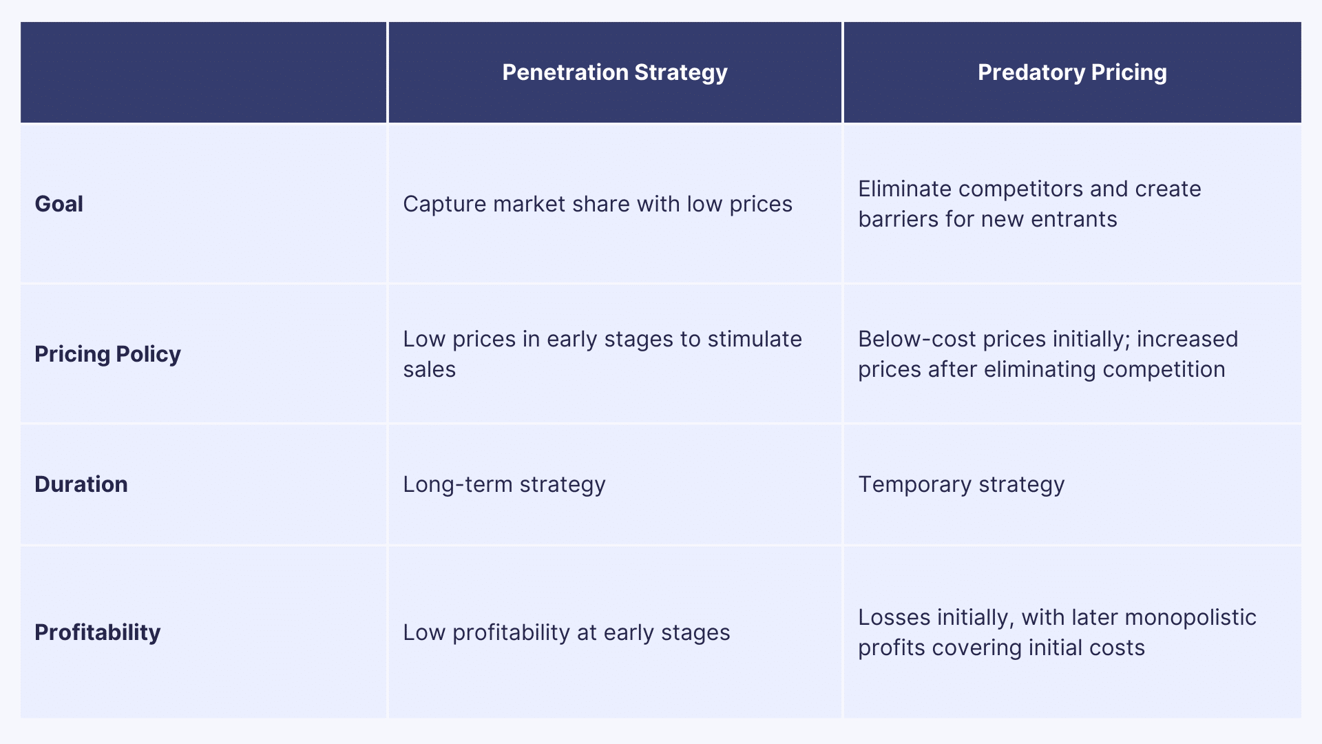 While both strategies use low prices to attract customers, their ultimate goals are different. A company employing predatory pricing seeks to dominate the market and later raise prices without facing competition, which can harm the entire industry. This approach is prohibited by antitrust laws in many countries.