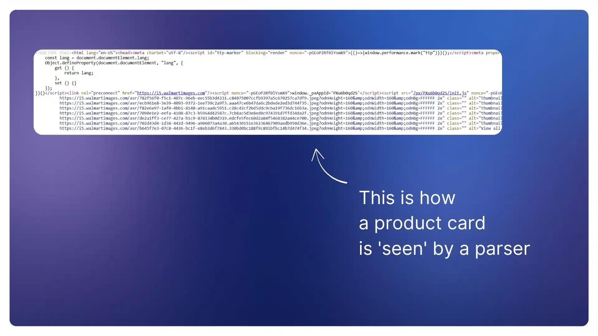 If you look closely at this HTML code, you won’t find the product name, price, or rating anywhere. All the content you see as a user is, in fact, invisible to the parser.