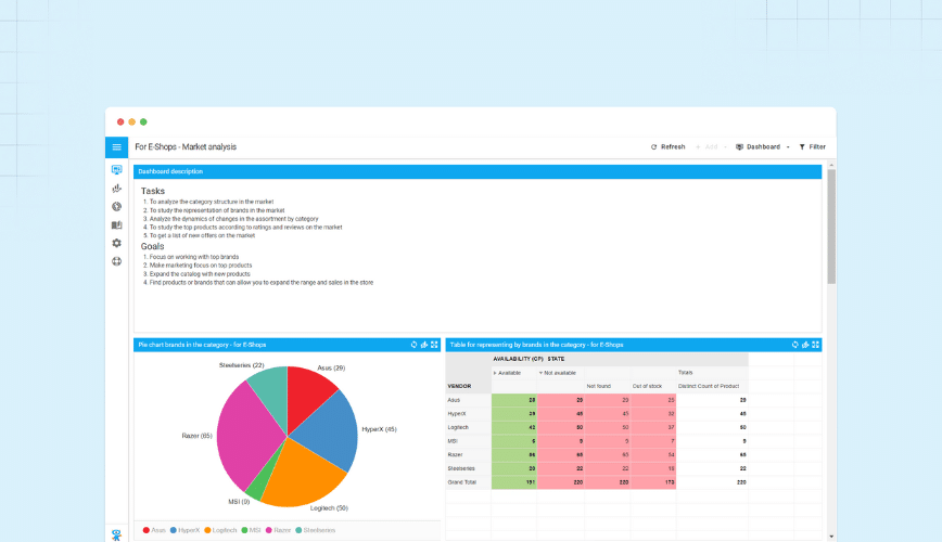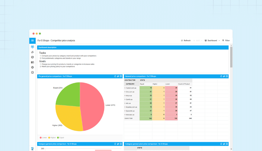 - Data analysis. In addition to the parser, Pricer24 has functionality that makes it a pricing intelligence service, not just a tool for collecting data. This includes functionality for comparing products and prices, dashboards to keep all important indicators at your fingertips, and reports to aggregate and visualize data.
