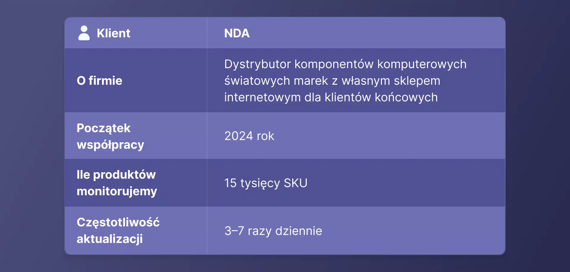Klient przekazał zespołowi Pricer24 swój katalog — początkowo obejmował on 2,5 tysiąca SKU — a także listę stron partnerów do monitorowania (21 sklepów internetowych) oraz specyfikację techniczną monitoringu cen na agregatorze cen Hotline. Po dopasowaniu i zestawieniu produktów parser Pricer24 rozpoczął codzienne zbieranie odpowiednich danych: