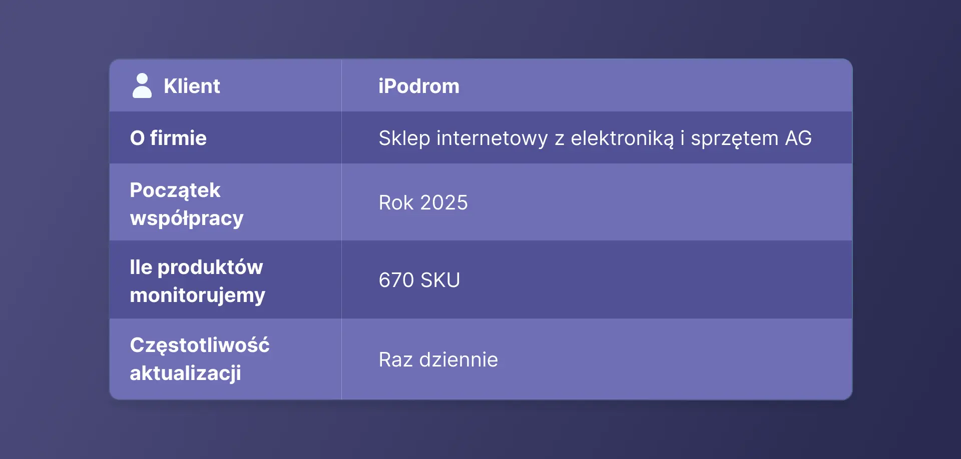 Skrócono czas przetwarzania cenników dostawców: z 10 godzin do 15–20 minut na jedno przetwarzanie (1000 produktów). Dzięki temu menedżer iPodrom może szybko określić minimalną cenę zakupu i obliczyć cenę sprzedaży do ponownej wyceny.