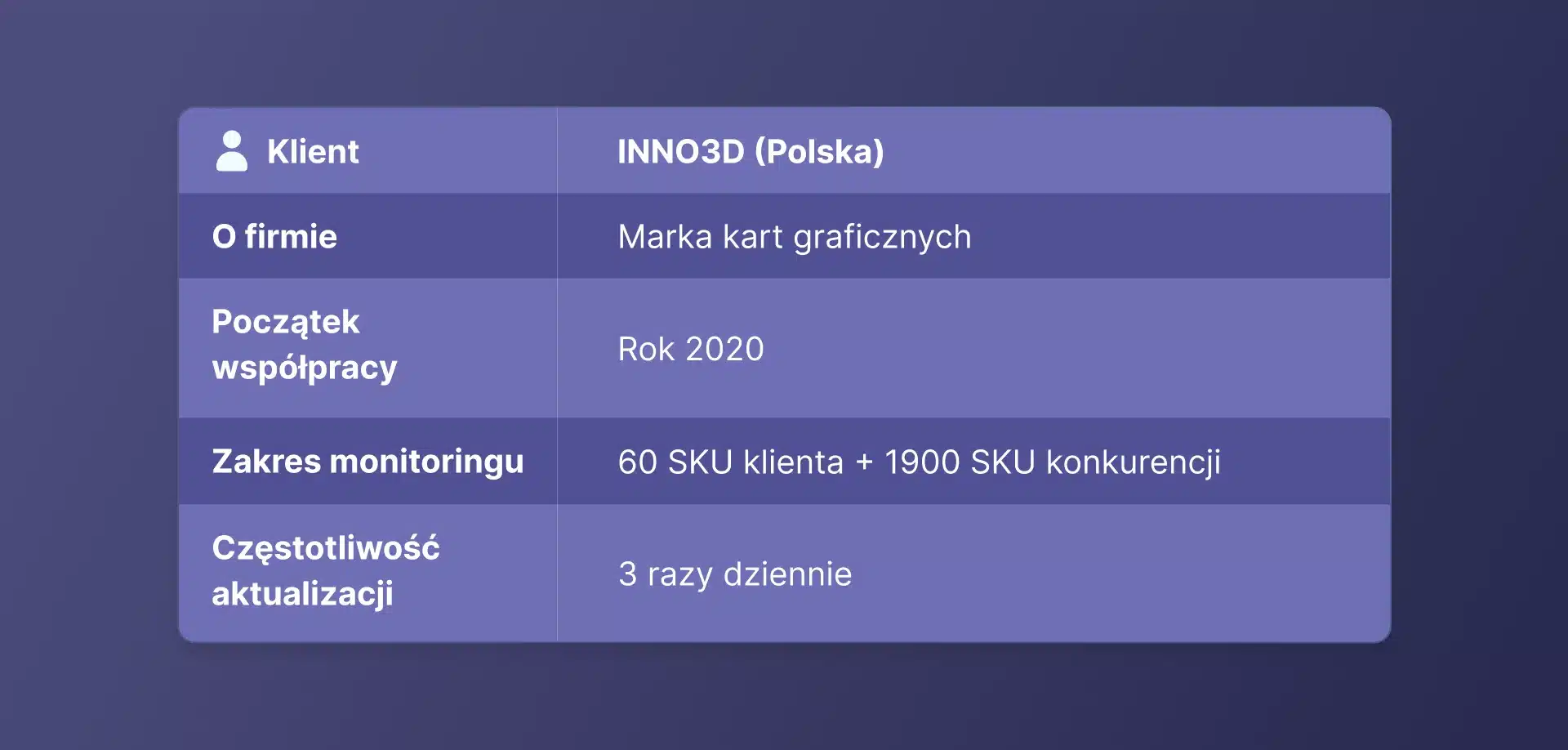 Ze względu na specyfikę wyboru kart graficznych przez konsumentów – wynikającą z podobieństwa parametrów technicznych różnych marek – rzetelna analiza konkurencji oraz monitoring pozycji marki i jej odpowiedników stanowią dla INNO3D zadania o kluczowym znaczeniu. Terminowe śledzenie i reagowanie na zmiany w dostępności, cenach, ocenach i opiniach dotyczących własnych produktów oraz produktów konkurencji jest gwarancją utrzymania konkurencyjności firmy na największych platformach sprzedaży online w Polsce.