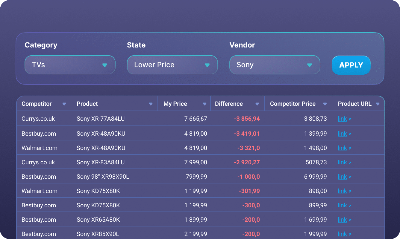 A convenient system of reports for tracking prices in real time. Speed up decision-making and win the price game with сompetitor price monitoring.