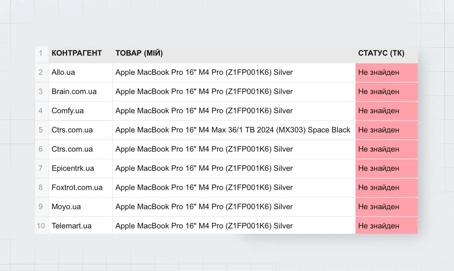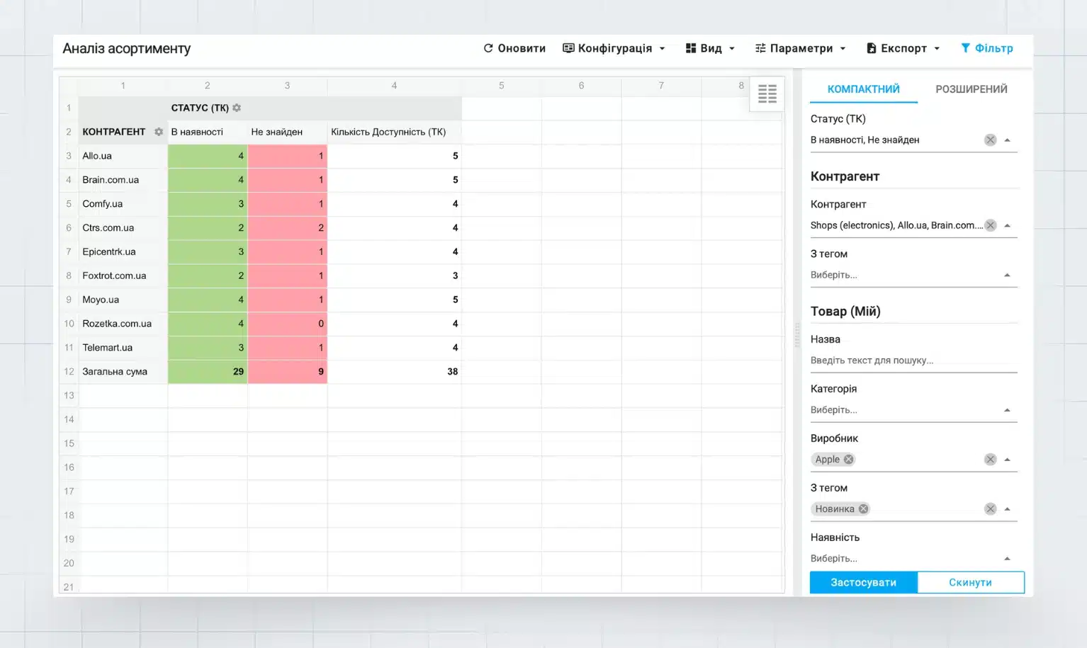 колонка «Не найдено» — количество партнеров, у которых товара нет в каталоге.