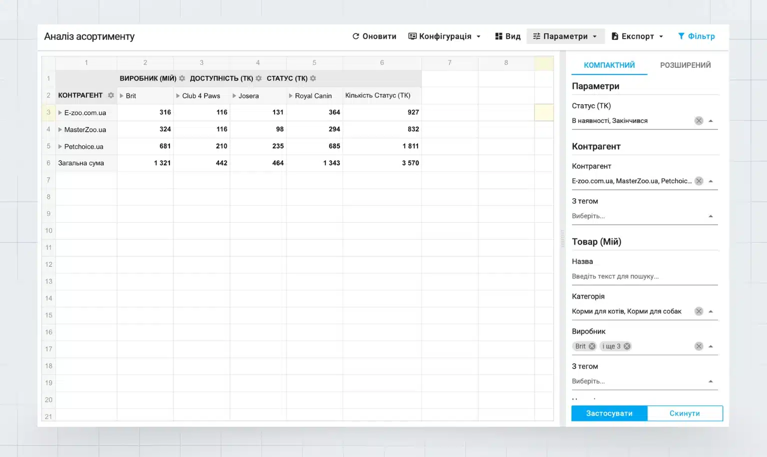 Примечание. Мы рассмотрели гипотетический сценарий и проанализировали всего четыре бренда (Brit, Club 4 Paws, Josera, Royal Canin) для демонстрации возможностей платформы. В реальности в него можно добавить любое количество конкурентов. Кроме того, стоит иметь в виду, что разница может быть как в ассортименте (например, у Club 4 Paws просто меньше товаров в портфеле), так и в дистрибуции (товары есть, но они не заведены в каталоги партнеров).