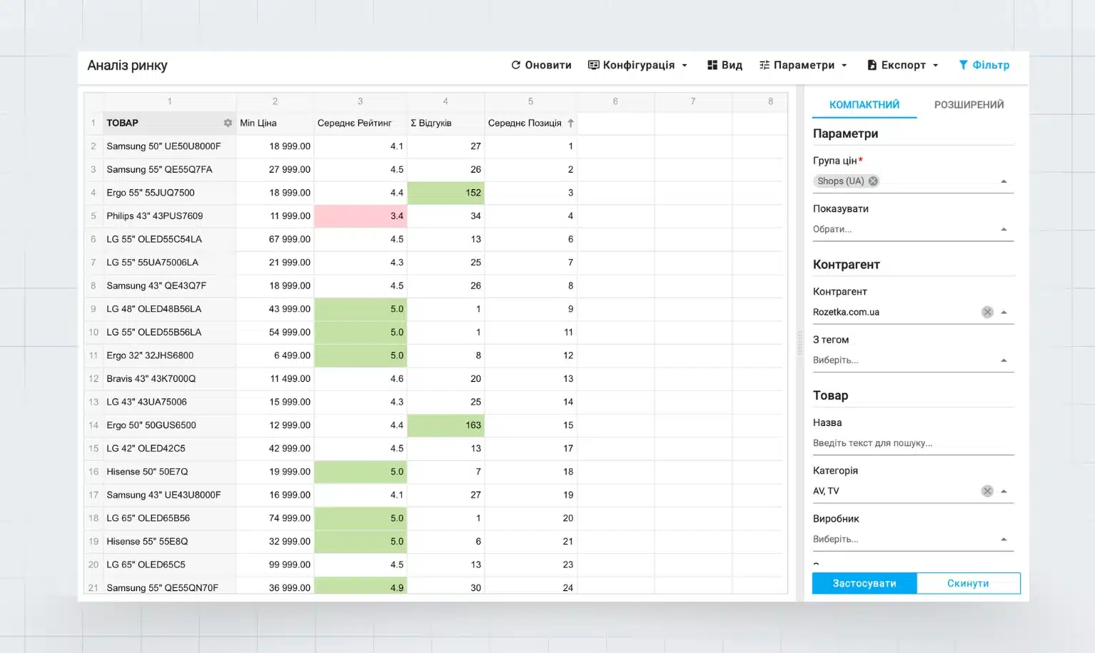 Таким образом Дмитрий выявил, что Rozetka фокусируется на бюджетных и среднесегментных моделях диагональю 43-55″. Он делает вывод, что для продвижения в этом интернет-магазине стоит фокусироваться на доступных моделях 43–55″ в ценовом диапазоне 12 000 — 22 000 грн.
