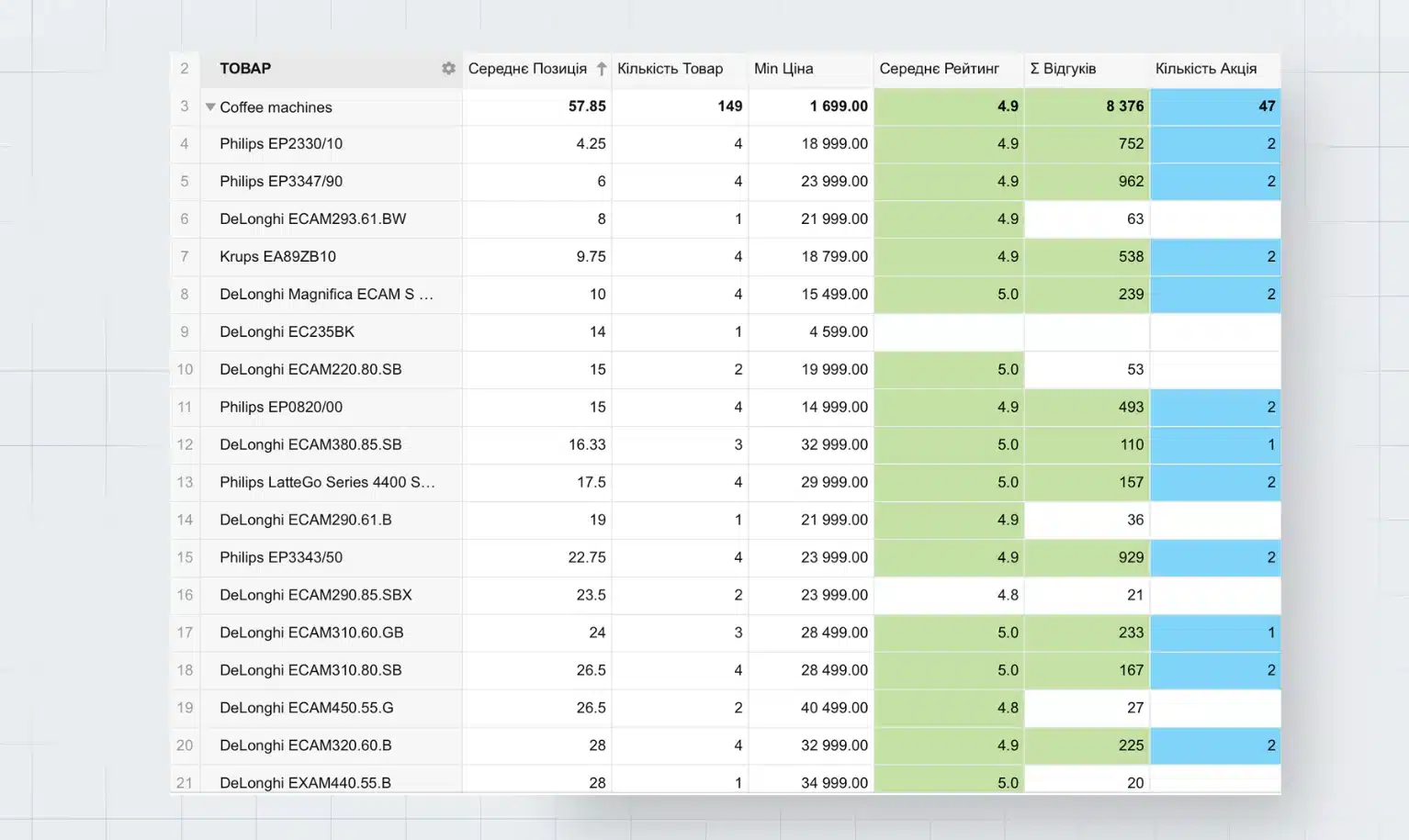 Этот отчет автоматически показывает позицию каждой модели в выдаче категории на сайтах партнеров, а также минимальную цену товара, количество отзывов на товар и наличие акций.