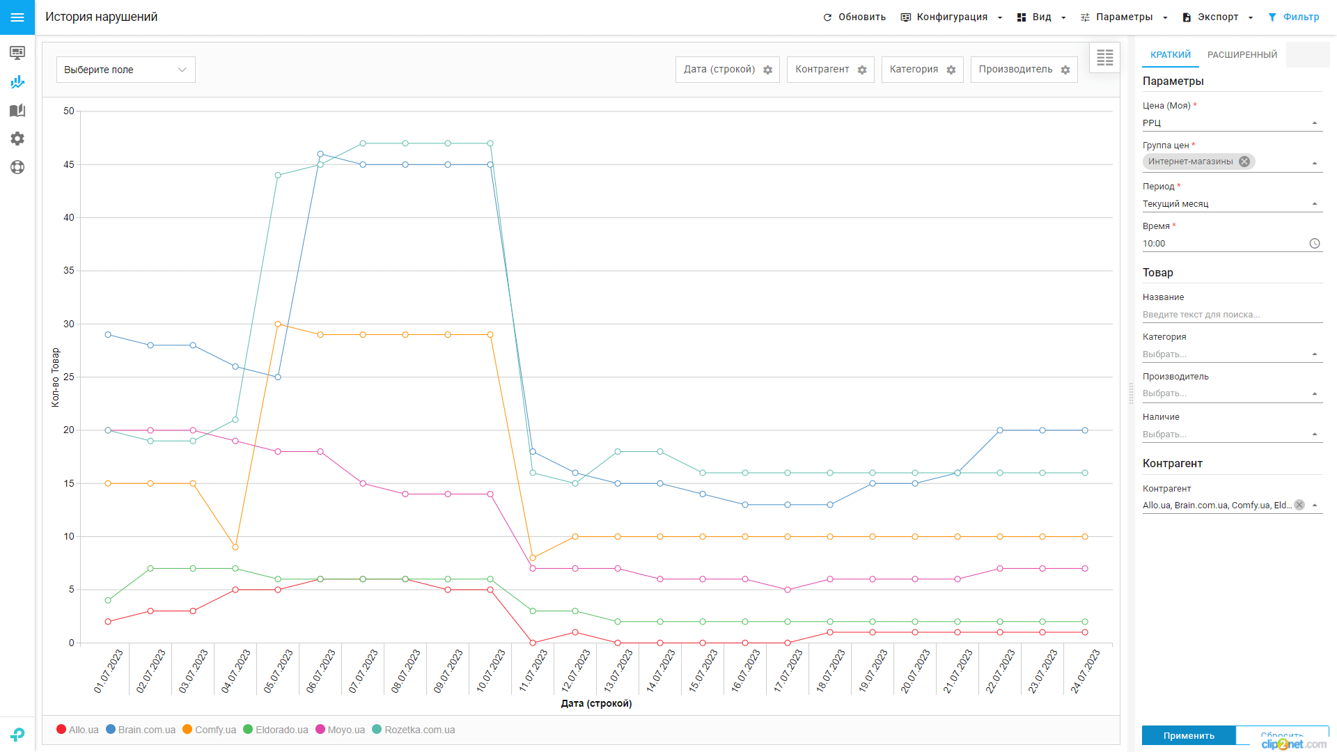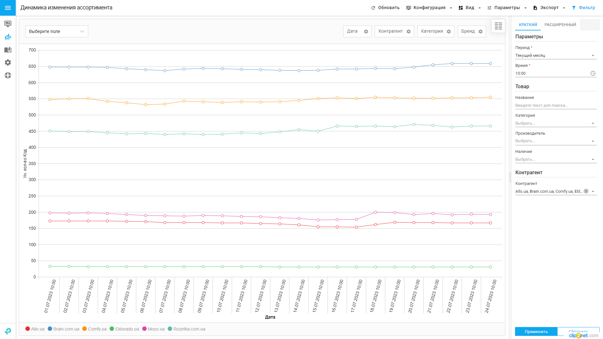 Мы передали команде Pricer24 наш каталог — более 250 SKU, а также список сайтов-партнеров для мониторинга — 24 интернет-магазина и прайс-агрегатор Hotline. Кроме того, предоставили список брендов-конкурентов в конкретных категориях — для мониторинга товаров-аналогов.
