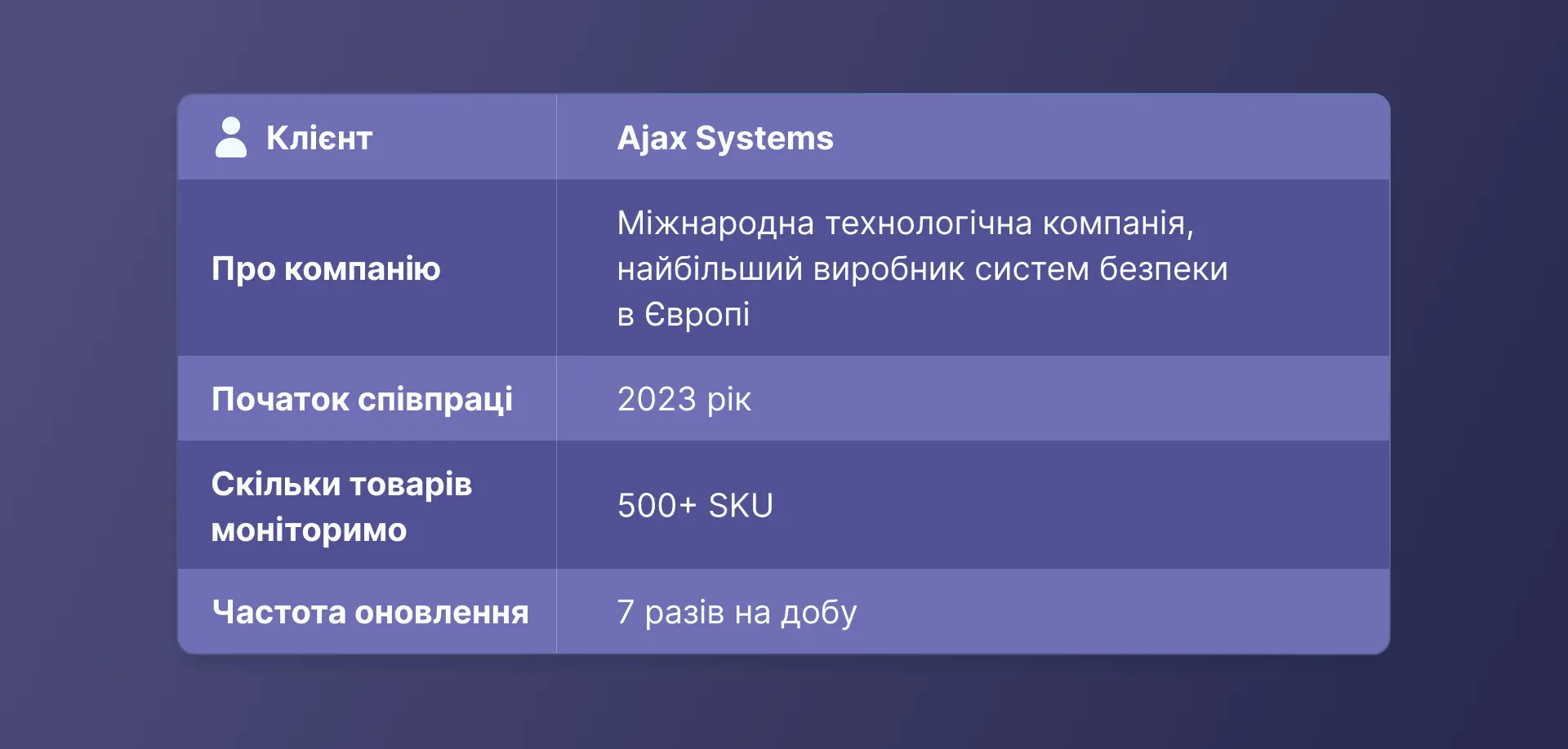 На початку співпраці команда Ajax Systems надала перелік з понад 150 товарних позицій*. Ми провели зіставлення з відповідними SKU на сайтах партнерів — це стало основою для подальшого точного моніторингу.